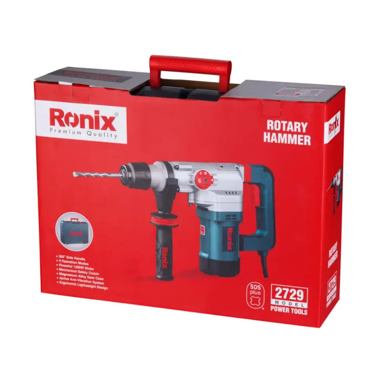 چنانچه به دنبال دریل بتن کن هستید، میتوانید محصولات شرکت «Ronix» «رونیکس» را بررسی و یک مورد را با اطمینان خاطر انتخاب کنید. و اما محصول پیش روی شما یکی از دریل بتن کن های ساخت رونیکس است که تحت عنوان مدل 2729 به بازار عرضه شده است. منبع تغذیه این ابزار برق بوده، ولتاژ آن 220 ولت و دارای ابزارگیر چهار شیار SDS Plus است. وزن این ابزار 4.6 کیلوگرم است. سرعت گردش آزاد این محصول 1000 دور بر دقیقه بوده، نرخ ضربه آن 4300 ضربه در دقیقه و توان آن 1200 وات است. حداکثر قطر سوراخکاری در مصالح این محصول 29 میلیمتر است و توان ضربه آن 4.6 ژول میباشد. این دستگاه به هنگام کار نیروی بسیار مطلوبی در کلاس وزنی خود را دارا میباشد و دارای استاندارد ISO 9001: 2008 بوده و از عملکرد بسیار خوبی برخوردار است. این دستگاه از متربال درجه 1 تحت استانداردهای روز اروپا تولید و به بازار عرضه گردیده است. اقلام همراه این دریل بتن کن عبارتند از: کیف BMC با کیفیت، دفترچه راهنما و کارت گارانتی، سه عدد مته و دو عدد قلم به همراه کیف مخصوص، دسته جانبی، میله عمق سنج، درپوش غبارگیر و گریس.