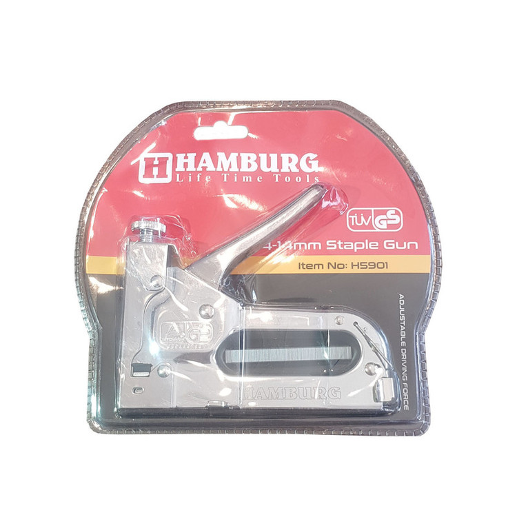 منگنه کوب دستی هامبورگ H5901 یک نمونه از ابزارآلات دستی می باشد که برای قرار گرفتن چندین برگه، پارچه و یا طلق و پلاستیک را می توان به یکدیگر متصل کرد. این محصولات معمولا به دو مورد منگنه کوب بادی و دستی وجود دارد. که منگنه های دستی مانند این مورد برای کارهای ساده که ضخامت چندانی ندارند و به فشار کمی نیازمند است مورد استفاده قرار میگیرد. معمولا این ابزار برای دفاتر و شرکت ها و بیشتر برای منگنه کردن کارتن و کاغذ و مقوا و یا پارچه های نازک مورد استفاده قرار می گیرد.