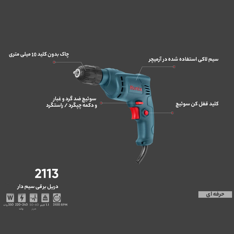 دارای سه نظام اتومات 10 میلیمتری مجهز به آرمیچر و بالشتک های صنعتی مطابق با استاندارد ce کلید دور متغیر با قابلیت راستگرد ، چپگرد و ضد غبار