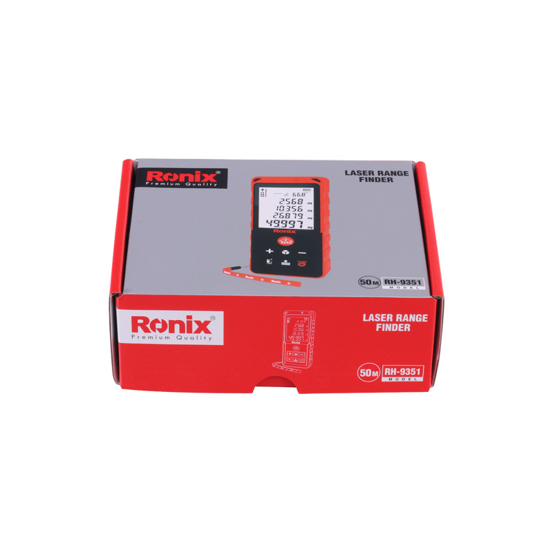 متر لیزری رونیکس مدل RH-9351 یک متر با قابلیت های عملکرد اندازه گیری به تمامی واحد های اندازه گیری بر اساس متر، فوت و اینچ و قابلیت تبدیل تمامی واحد های اندازه گیری به یکدیگر نیز می باشد. این متر مجهز به صفحه کلید روان با عمر و کارکرد مستمر است. این دستگاه دارای قابلیت اندازه گیری مستمر و دلخواه جهت محاسبه جابجایی را دارد همچنین انجام عملیات کاربردی تکمیلی اندازه گیری ماند مشخص کردن حد اقل و حداکثر، قابلیت جمع و تفریق محاسبه ی مساحت، اندازه گیری حجم و محاسبه ارتفاع با کمک فرمول فیثاغورث است. سرعت اندازه گیری و دقت این محصول بسیار بالا بوده که باعث ایجاد سهولت در حین کار می شود. این دستگاه با منبع تغذیه باطری کار می کند و وزن آن با باطری به 92 گرم می رسد و دارای استاندارد های لازم اروپا و شرکت رونیکس می باشد . متر های لیزری در اندازه گیری زمین ها ، ساخت و ساز های شهری، دکوراسیون، نصب و … مورد استفاده قرار می گیرد. این متر ها با توانایی هایی که دارند نظیر اندازه گیری دقیق و سریع و با سرعت انتقال و سهولت کاربری همچنین اندازه گیری شیب، طول، حجم و ارتفاع می توانند تاثیر بسزایی در بهبود و سرعت عملکرد پروژه های مختلف داشته باشند. این محصول در محاسبات عمرانی، دکوراسیون و نصب کارایی بسزایی دارد. جهت جلوگیری از آسیب های احتمالی یک کیف برزنتی طراحی شده و همچنین یک بند آویز برای ایمنی دستگاه هنگام استفاده همراه با آن عرضه می شود.